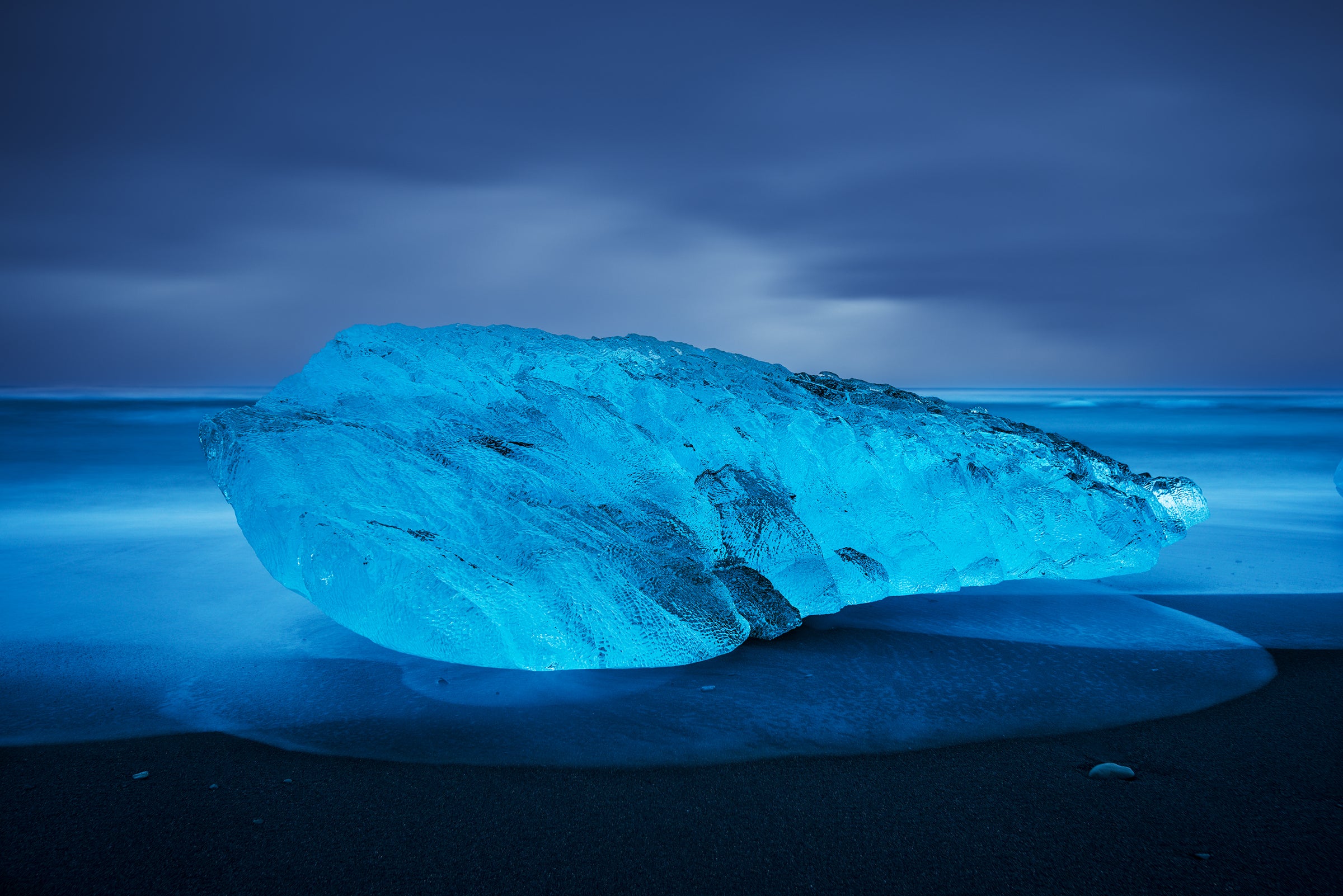 I still remember standing on that black sand beach, the bitter cold cutting through me as the ocean rolled in and filled my boots. Among the hundreds of ice fragments washed ashore, this one immediately stood apart. Its striking electric blue reveals its age, ice calved from a nearby glacier and shaped by the elements.