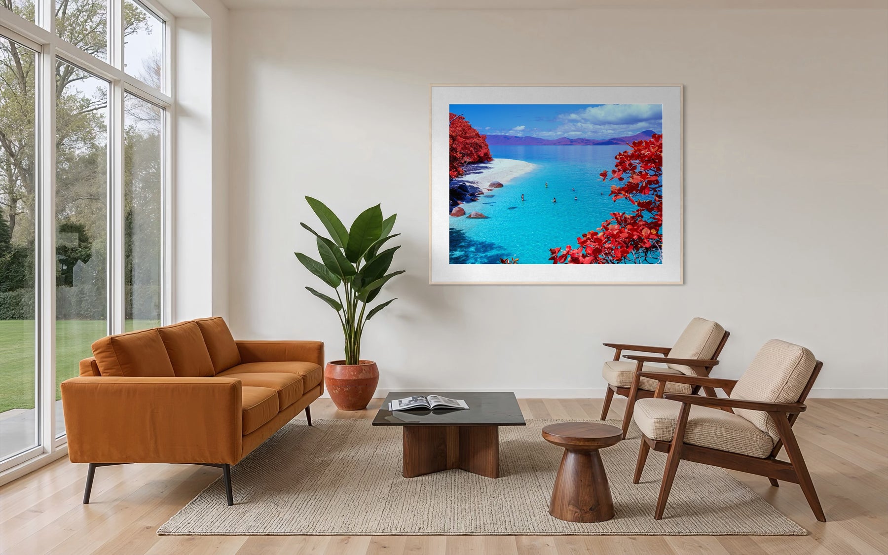 Photographed on Fitzroy Island, This series reimagines tropical landscapes through the surreal lens of Kodak aerochrome colour mapping. the technique, once used in infrared film for aerial reconnaissance transforms the natural palette into luminous reds and electric blue, reframing the familiar as other worldly.